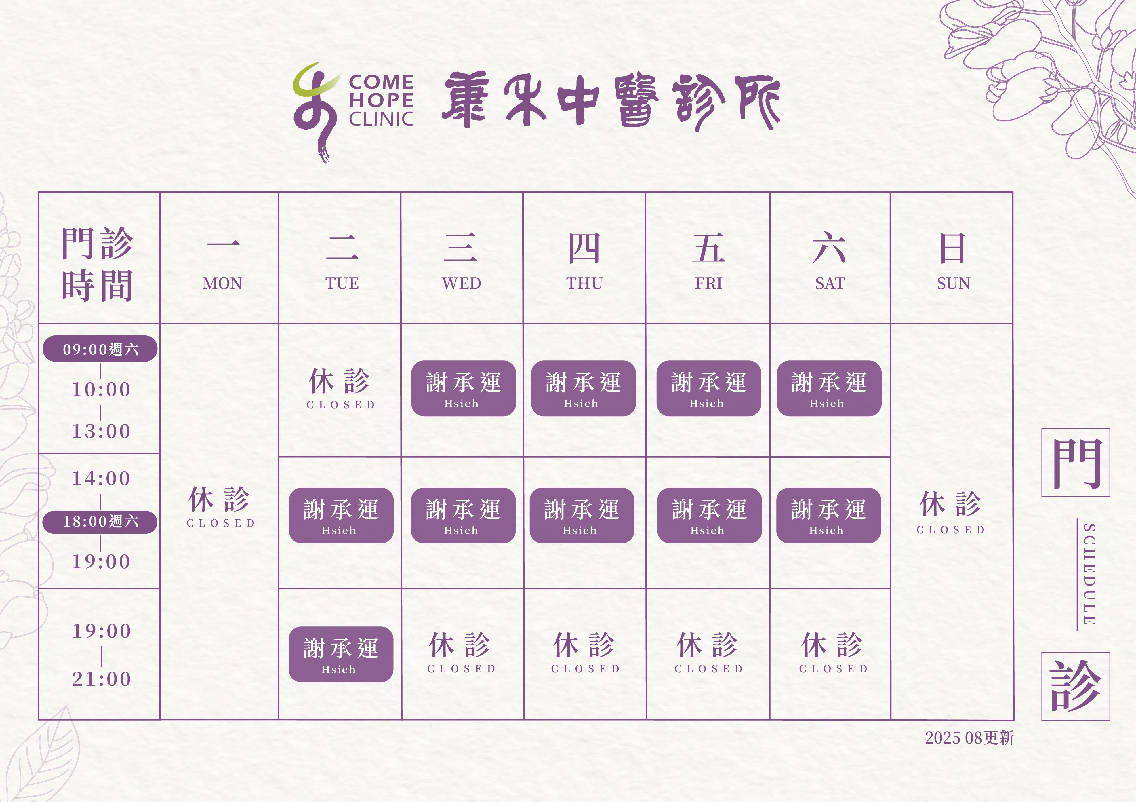 14:00-18:00 | 休診 | 謝承運 楊宗翰 | 謝承運 楊宗翰 | 謝承運 | 謝承運 楊宗翰 | 謝承運 | 休診 |